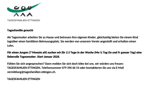 Herzlich Willkommen bei Tagesfamilien Ettingen. Der Verein Tagesfamilien Ettingen setzt sich zum Wohl des Kindes und der Familie für eine qualifizierte, individuelle und familienergänzende Kinderbetreuung ein.